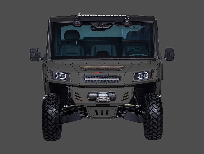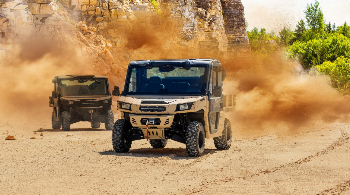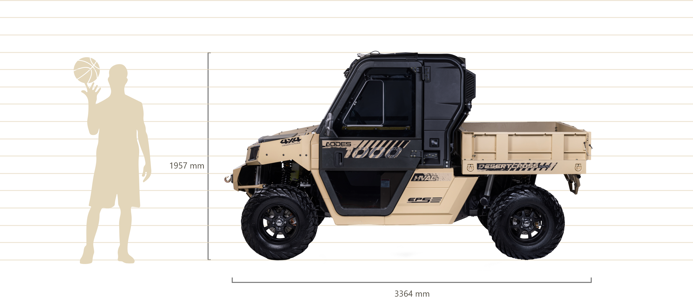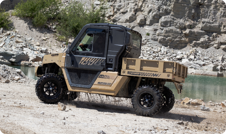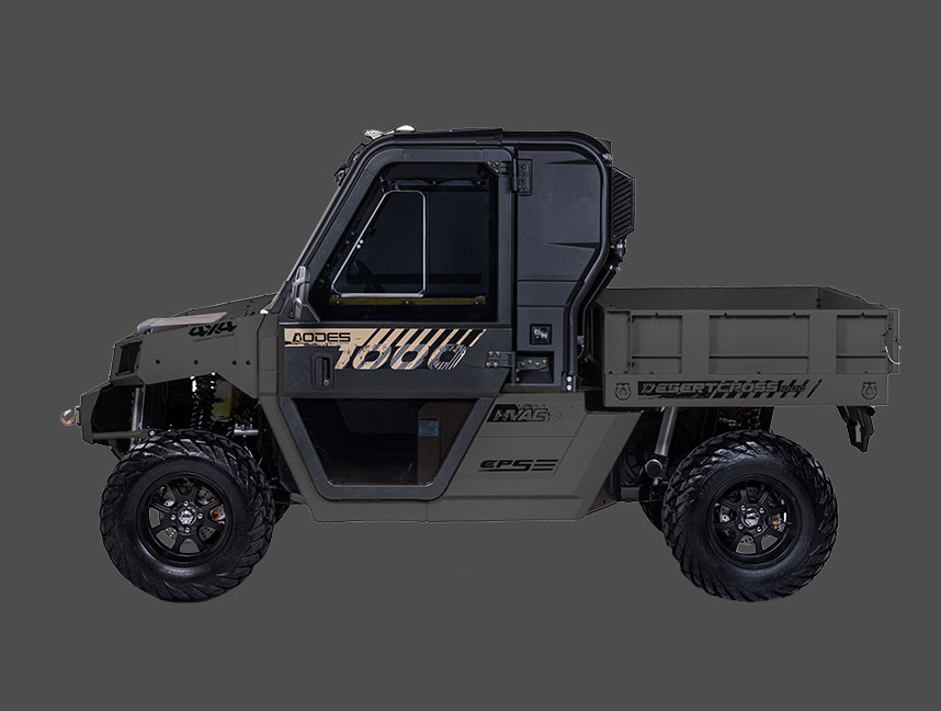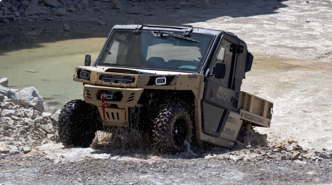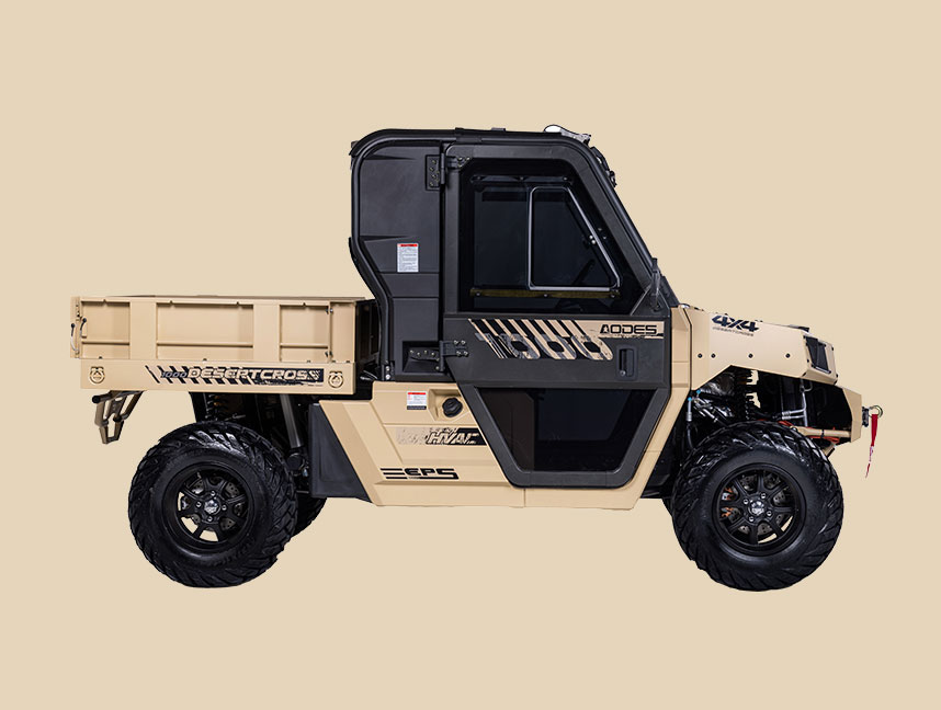 Die DesertCross von ODES ist ein kompromissloses Kraftpaket mit Straßenzulassung (T1b, 60 km/h) und maximaler Offroad-Performance. Ihr robustes Metall-Chassis, die massive Bauweise und die vollständig kippbare Metall-Ladefläche machen klar: Dieses Fahrzeug ist für extremes Gelände gebaut. Ausgestattet mit Klimaanlage und Heizung, Seilwinde, LED-Lightbar, Frontscheibe mit Wischer und Bumper bringt die DesertCross alles mit, was du für extremes Gelände brauchst.